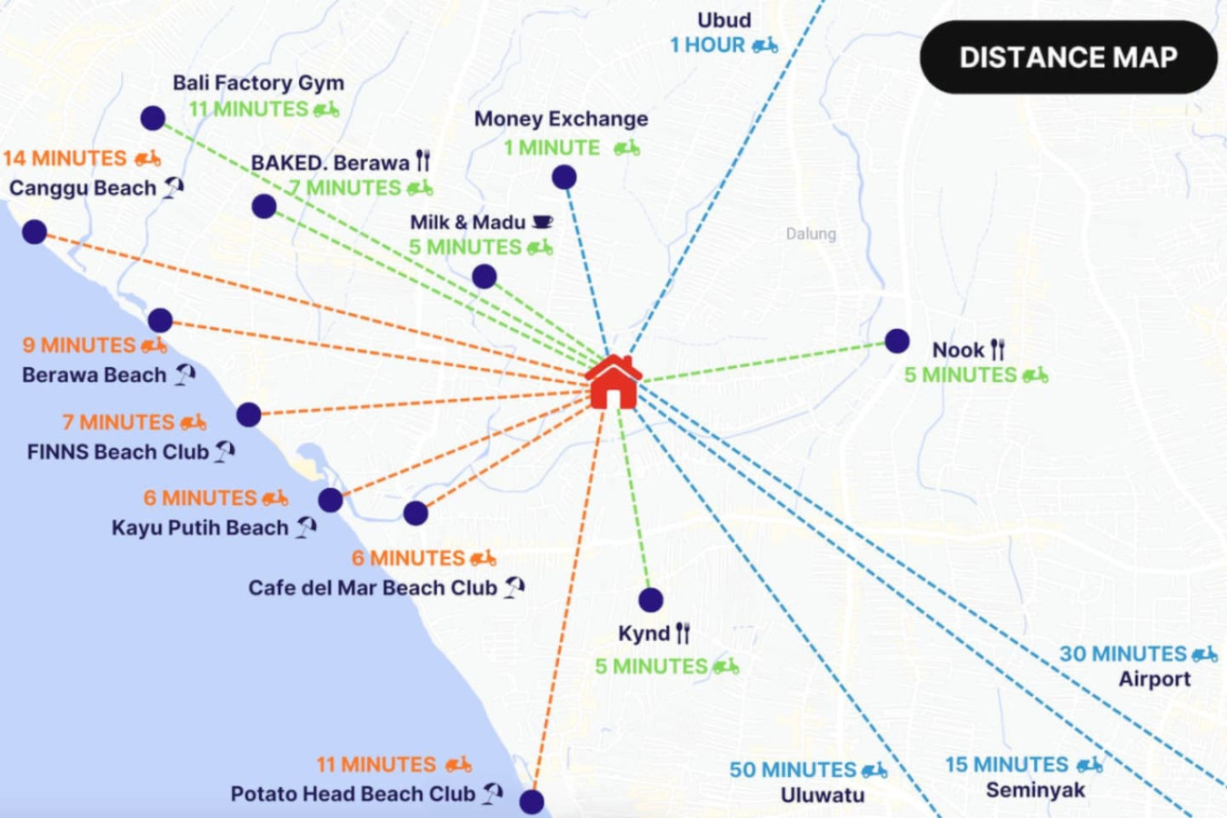 We’re about 14km away from Gusti Ngurah Rai International Airport. Depending on traffic, your travel time can change.