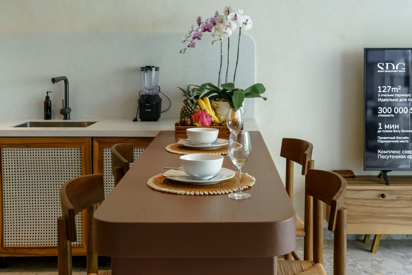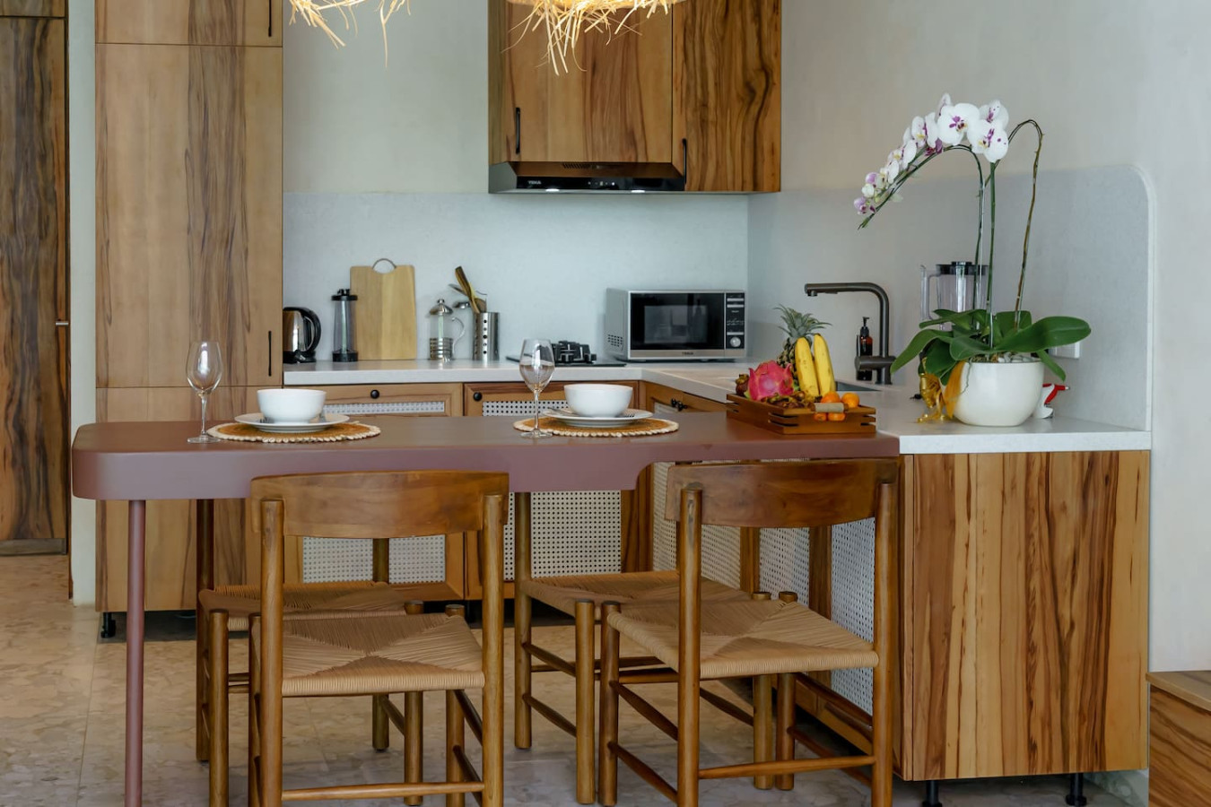 Experience seamless connectivity with high-speed WiFi and productivity with a dedicated work desk. Our villa boasts a private pool and lush tropical terrace for relaxation, alongside a fully equipped kitchen with dining area and a cozy living room for ultimate comfort.