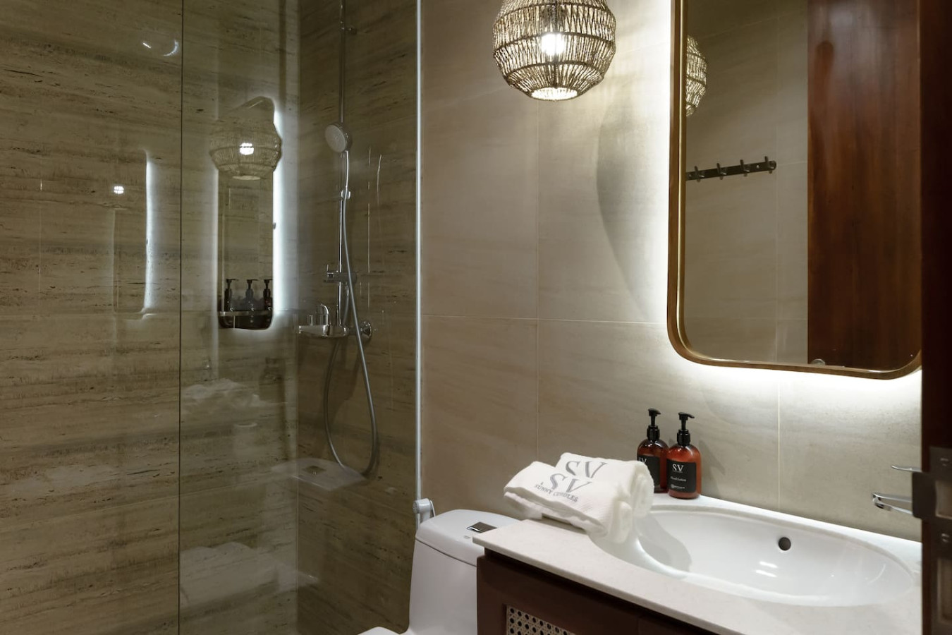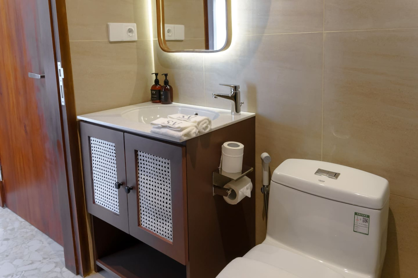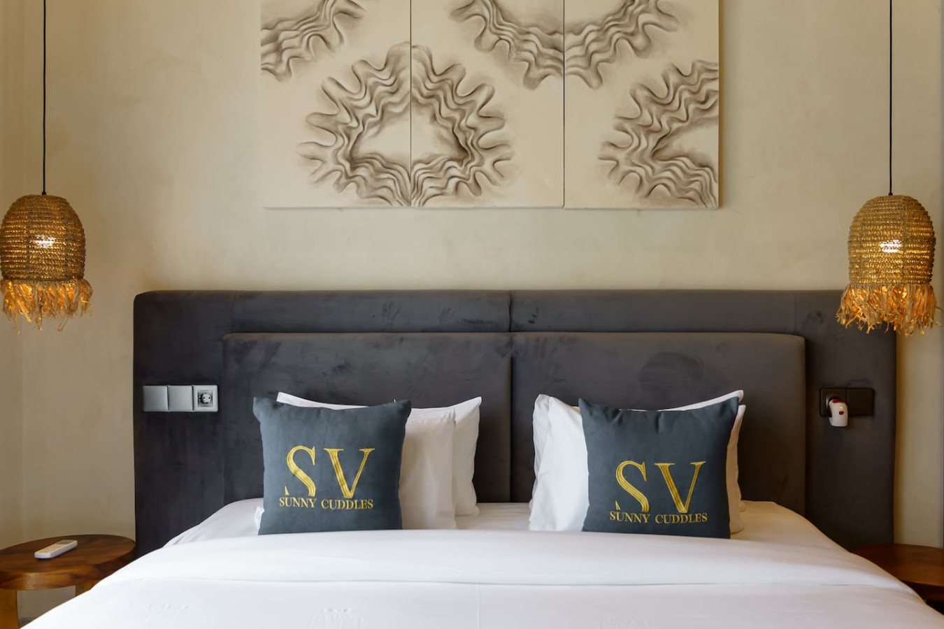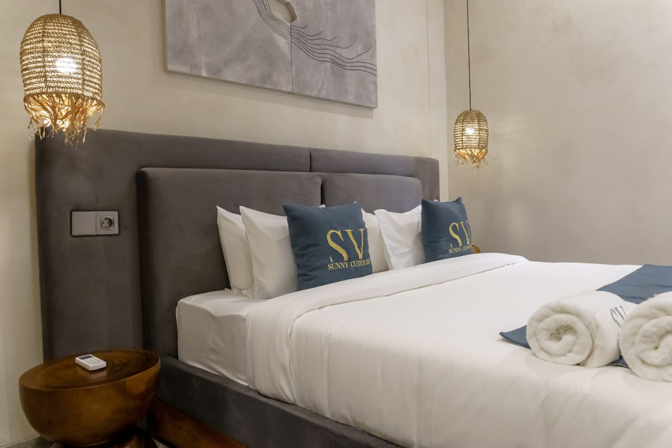 Escape to our stylish 2-bedroom villa near Berawa Beach. It’s all about comfort and style here, with a peaceful pool surrounded by greenery. Ideal for beach fans and those who enjoy the finer things, providing a special hideaway with comfortable spaces, bright decorations, and everything for a relaxing and chic vacation