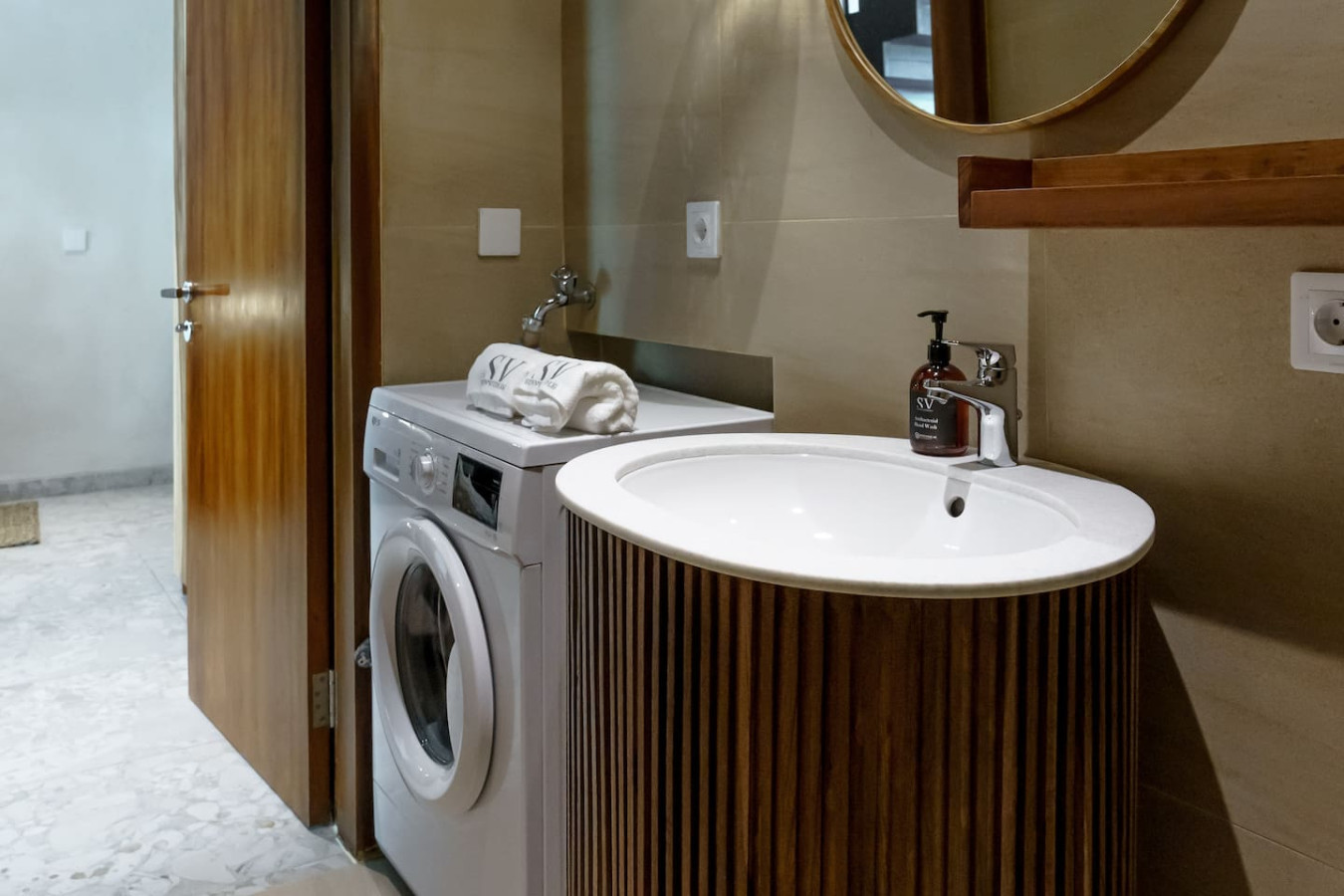 ‣ A washing machine is conveniently located in the half bathroom for laundry needs