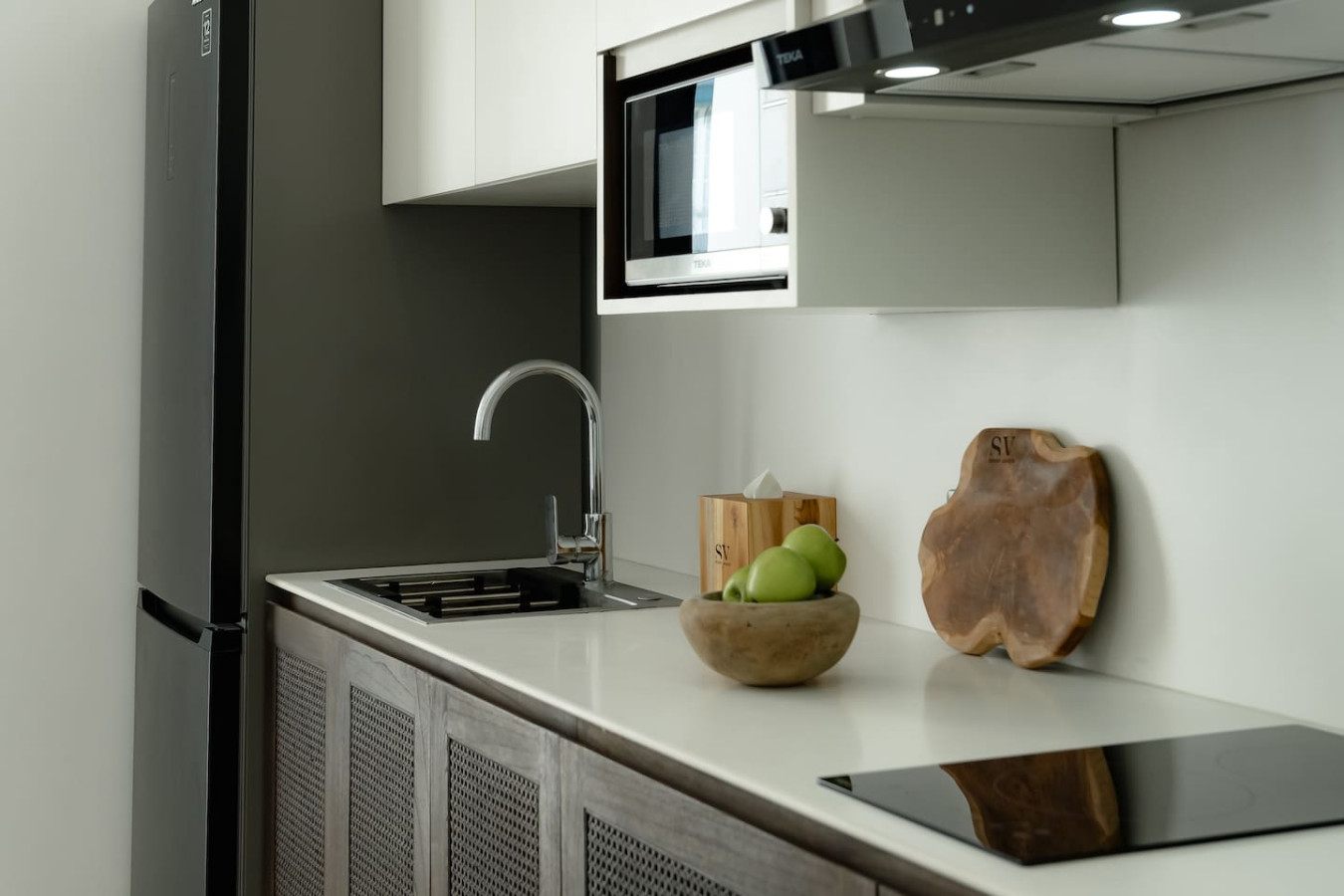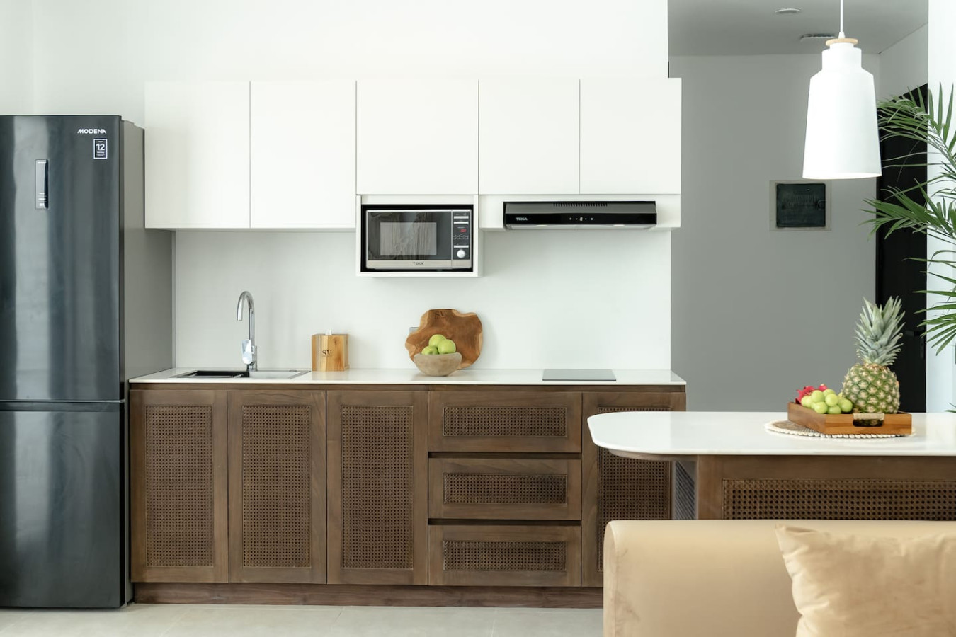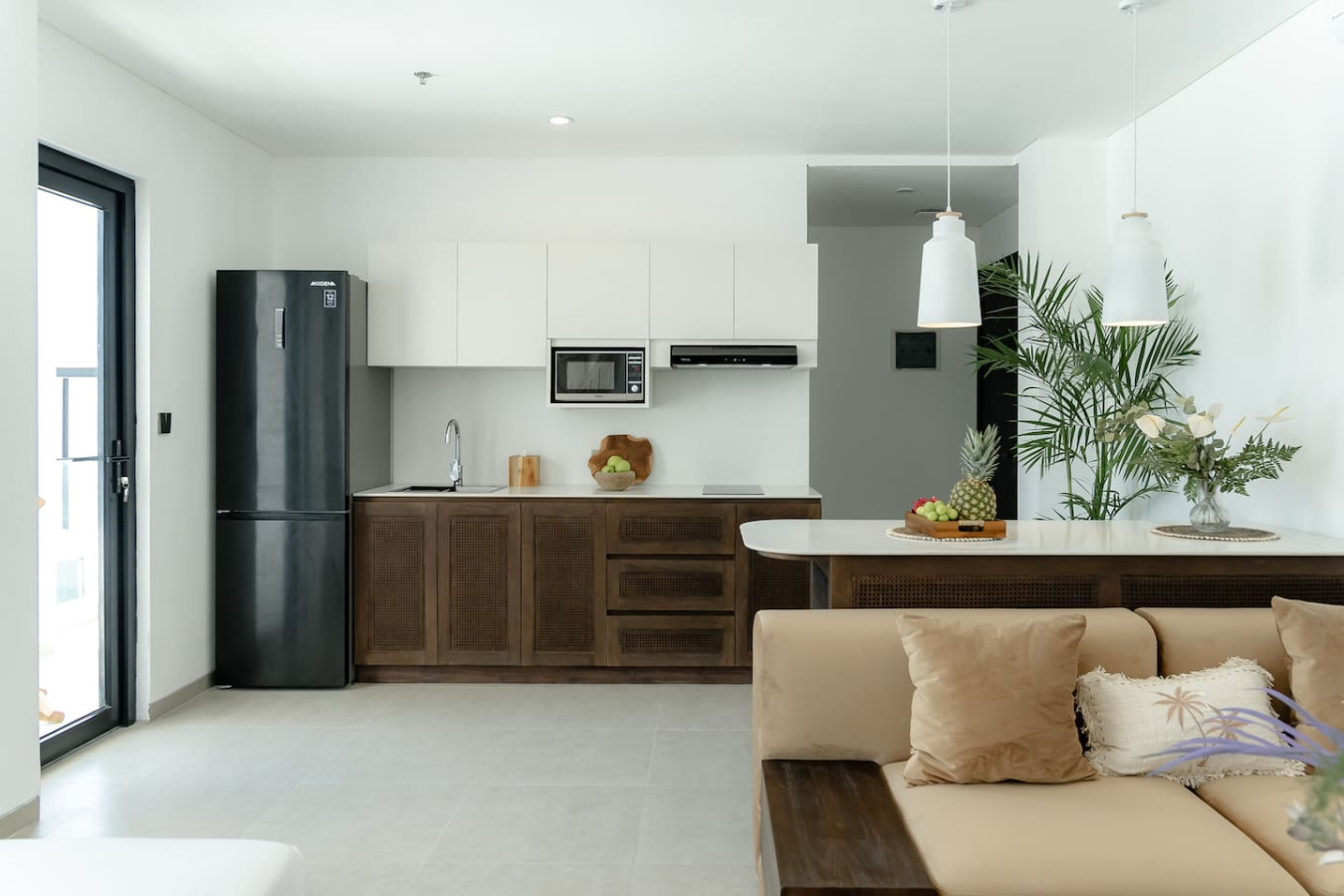 – Fully equipped gourmet kitchen with high-quality appliances: electric stove, fridge, blender, kettle, and microwave.