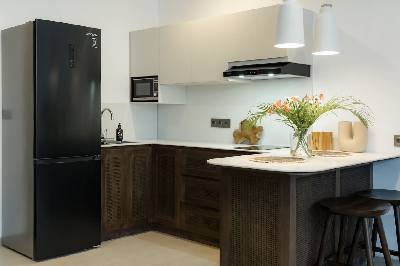 – Gourmet kitchen, fully equipped with modern appliances, including an electric stove, refrigerator, blender, kettle, and microwave.