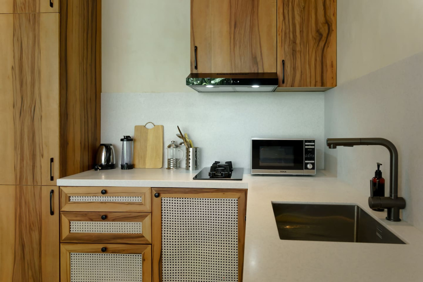 ‣ Includes a refrigerator, stove, microwave, blender, and electric kettle
